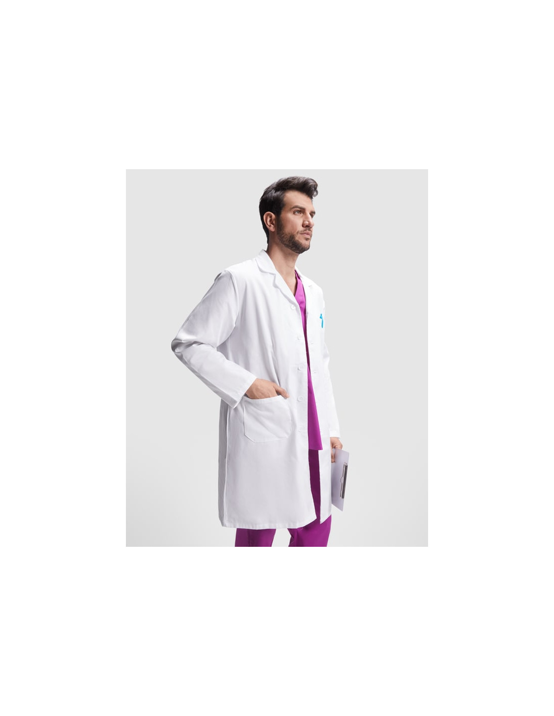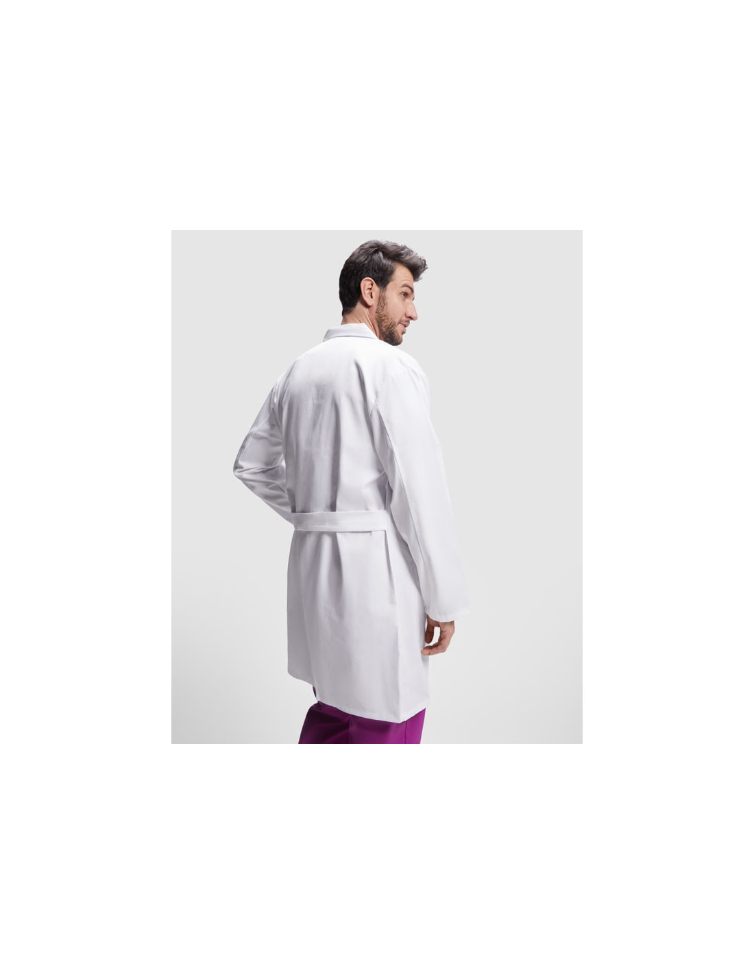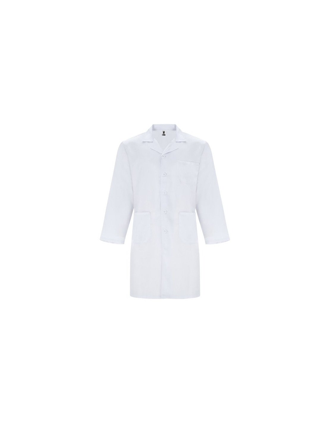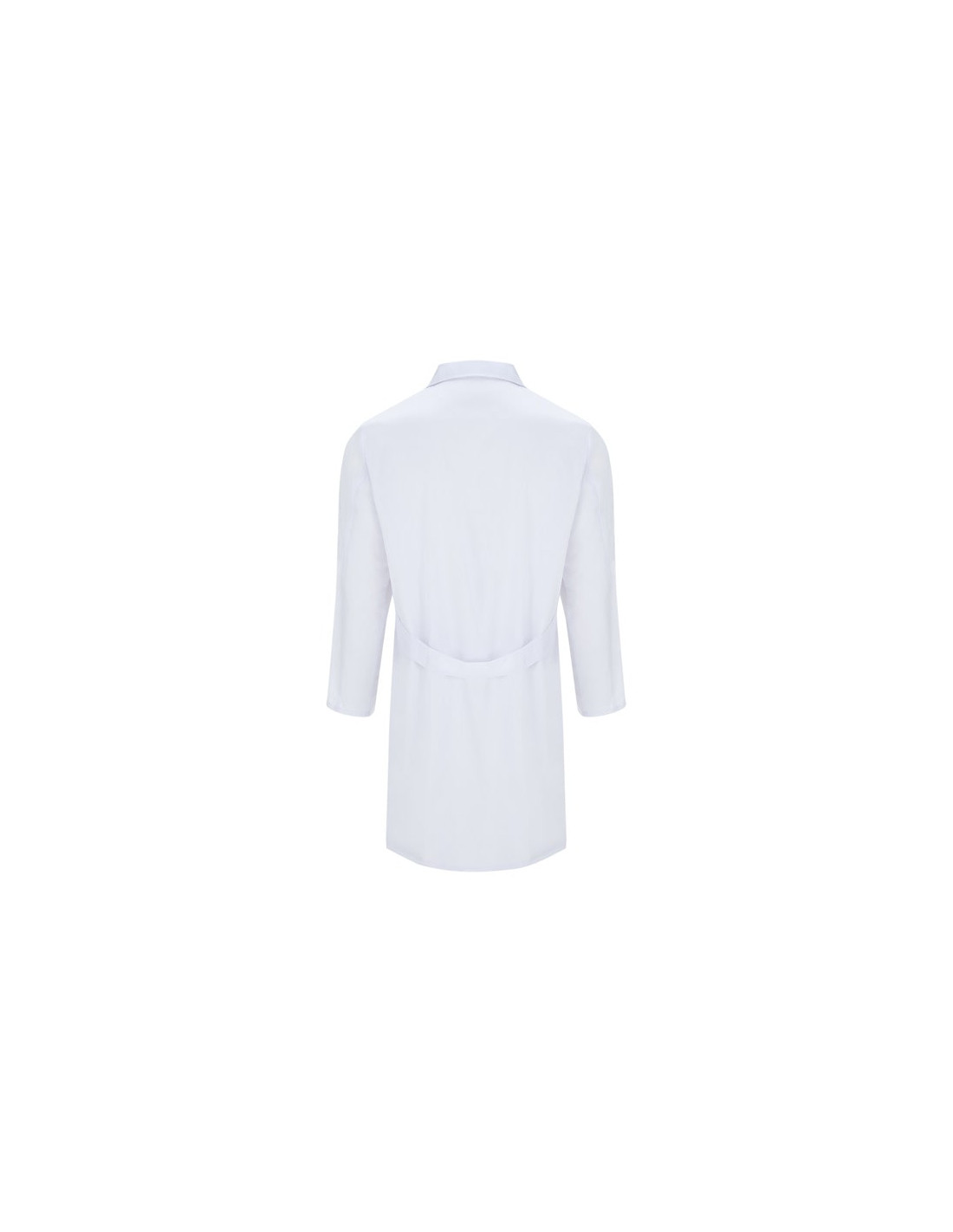 Bata de servicios de manga larga. Cuello con solapa. Apertura central con 5 botones a tono. Un bolsillo en pecho y dos laterales. Cinturilla trasera.