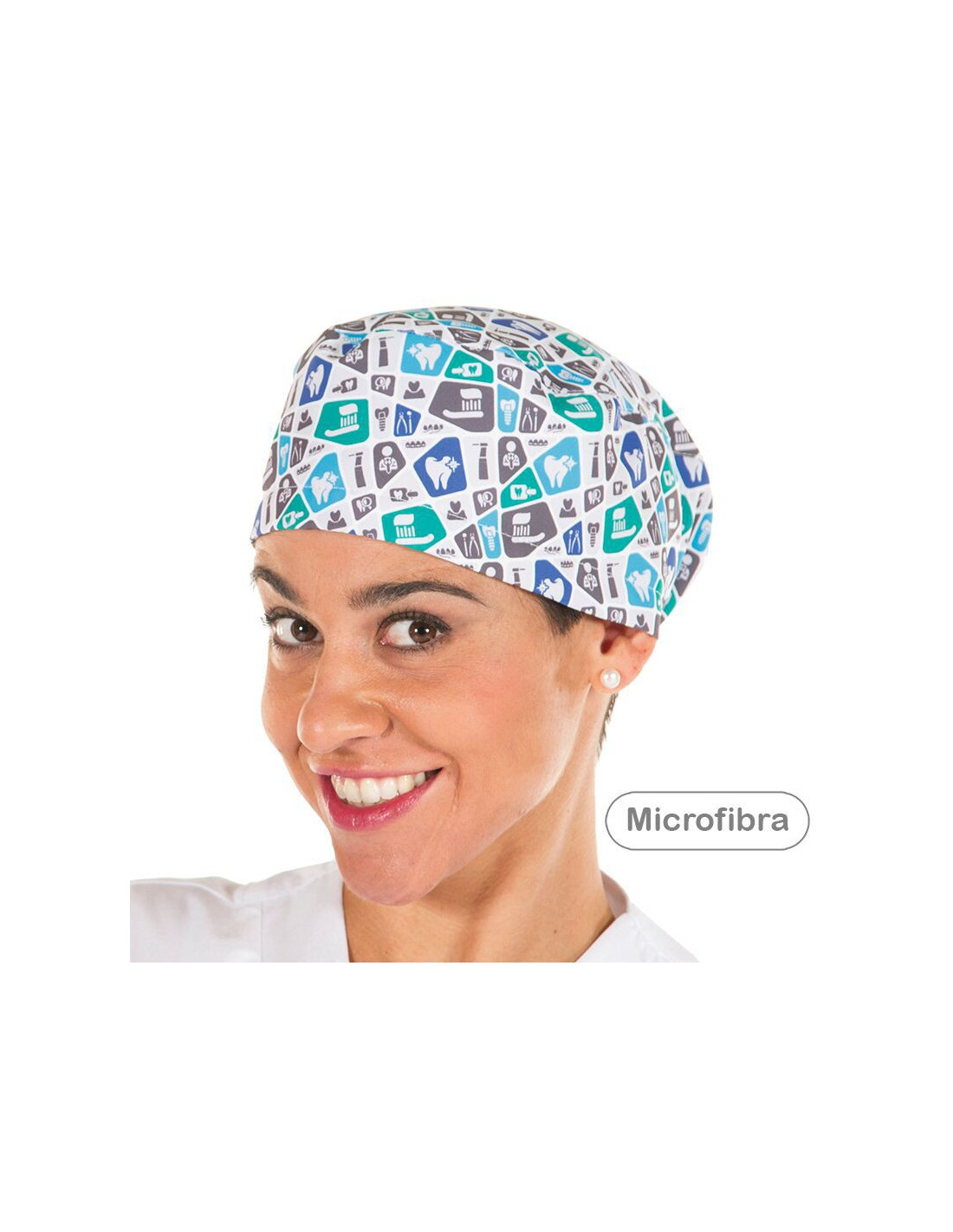Gorro sanitario de cirujano con gomas elástico, talla única. Tejido absorbente para sudoración en frontal interior. Gorro original con estampación de diseño fluor. Tejido microfibra: Antibacterias Repele los líquidos Repele cabello y pelo de mascotas Muy alta transpirabilidad No necesita planchar No se alteran los colores ni dibujos Tolerancia a salpicaduras de lejía Seca muy rápido Lavabl